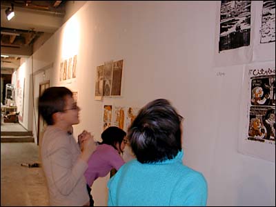 First we put all the prints brough from Finland to the wall. And after that we started to draw straight to the wall with chrachoal .