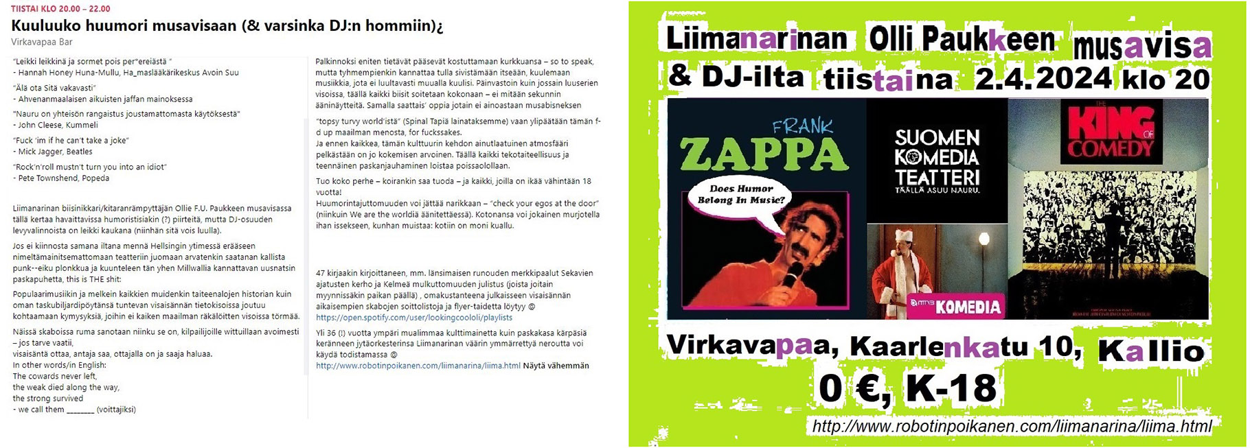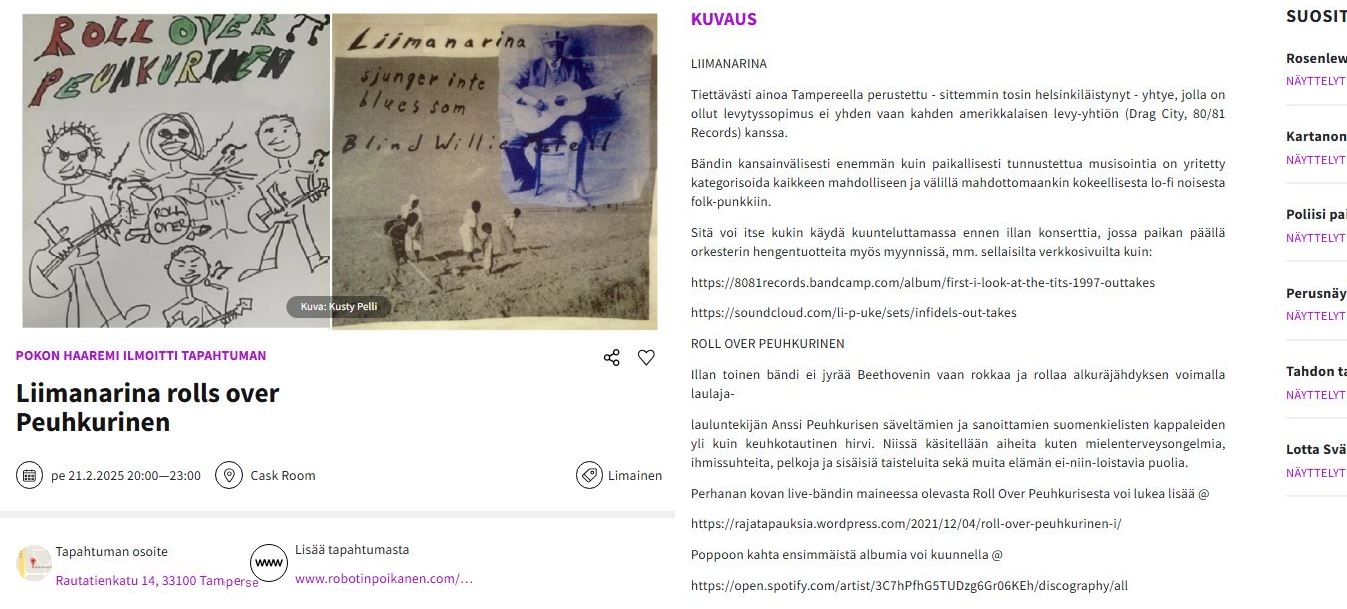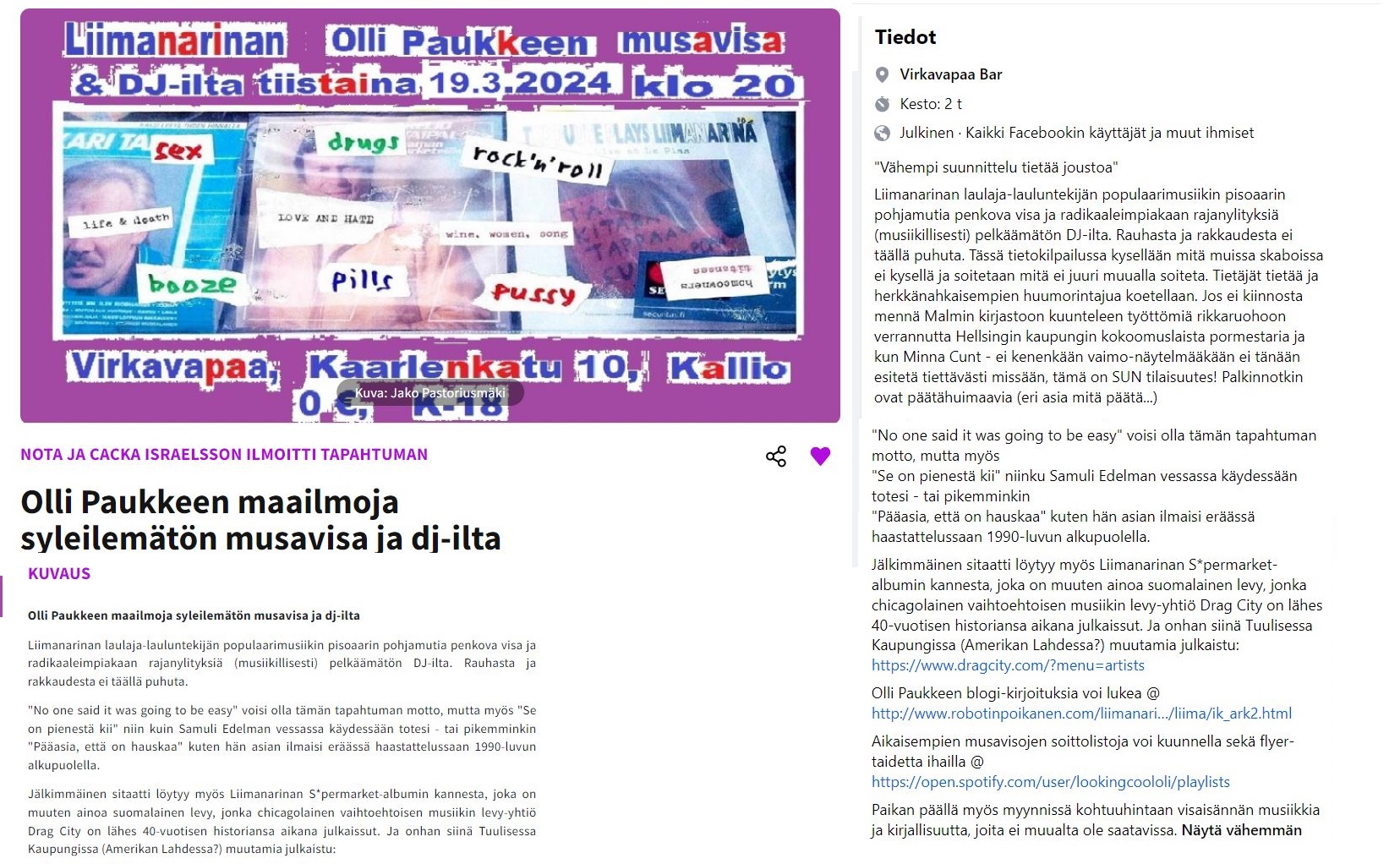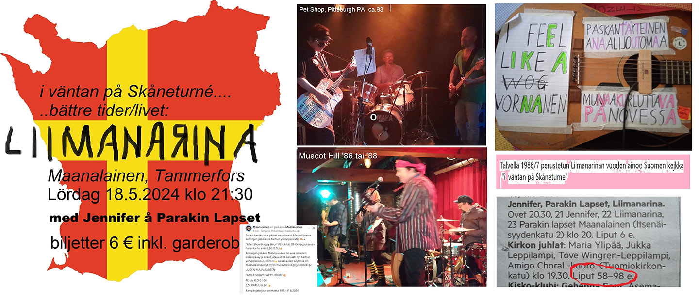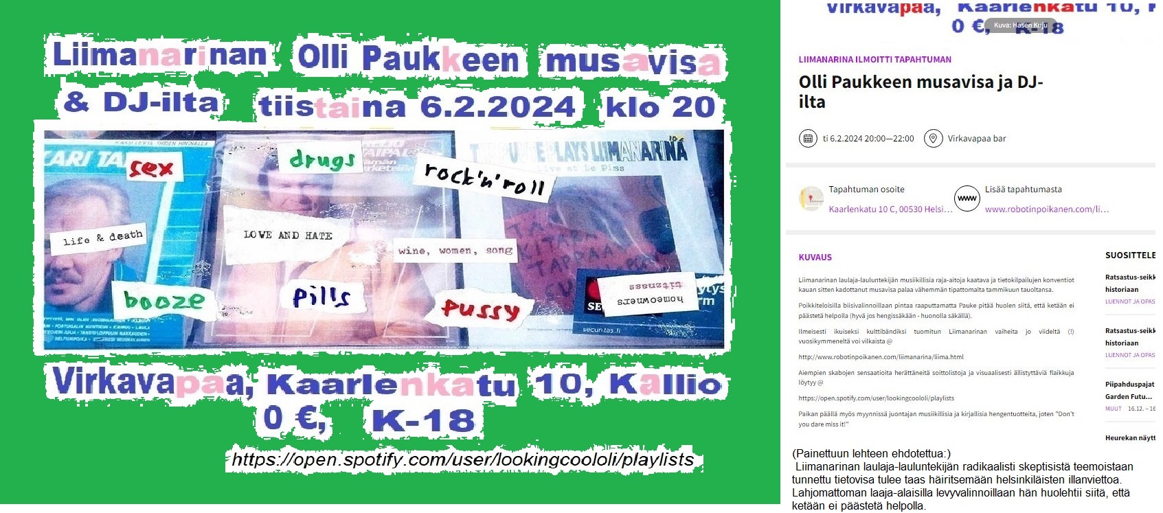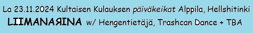"Jos Räjäyttäjät ei ole tarpeeksi räyhäkäs, karhea ja vittumainen, kannattaa suunnata legendaarisen kulttiyhtye Liimanarinan keikalle. Folk-punkia esittävä Olli Paukkeen kipparoima yhtye kuuluu niihin harvoihin suomalaisiin bändeihin, jotka ovat julkaisseet musiikkiaan kokeelliseen pop-musiikkiin erikoistuneen chicagolaisen Drag Cityn (mm. Joanna Newsom, Bill Callahan, Pavement) kautta. Mukana feattaamassa soolouraltaan ja Mustat Kalsarit -yhteistyöstä tuttu laulaja-lauluntekijä Hulda Huima."